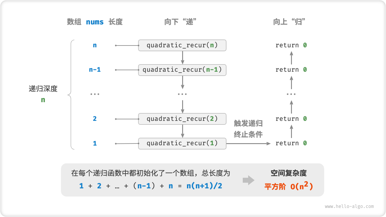如图 2-18 所示,该函数的递归深度为 \(n\) ,在每个递归函数中都初始化了一个数组,长度分别为 \(n\)、\(n-1\)、\(\dots\)、\(2\)、\(1\) ,平均长度为 \(n / 2\) ,因此总体占用 \(O(n^2)\) 空间: