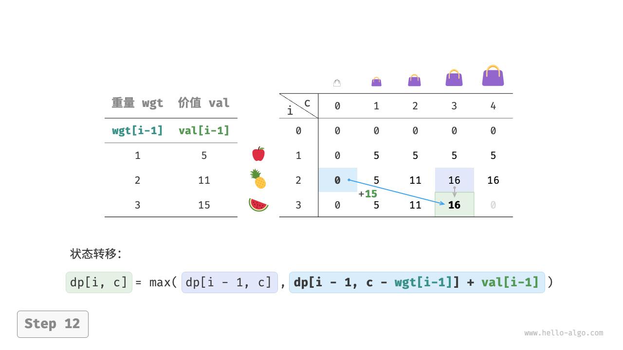 上述分析向我们揭示了本题的最优子结构:最大价值 \(dp[i, c]\) 等于不放入物品 \(i\) 和放入物品 \(i\) 两种方案中价值更大的那一个。由此可推导出状态转移方程: