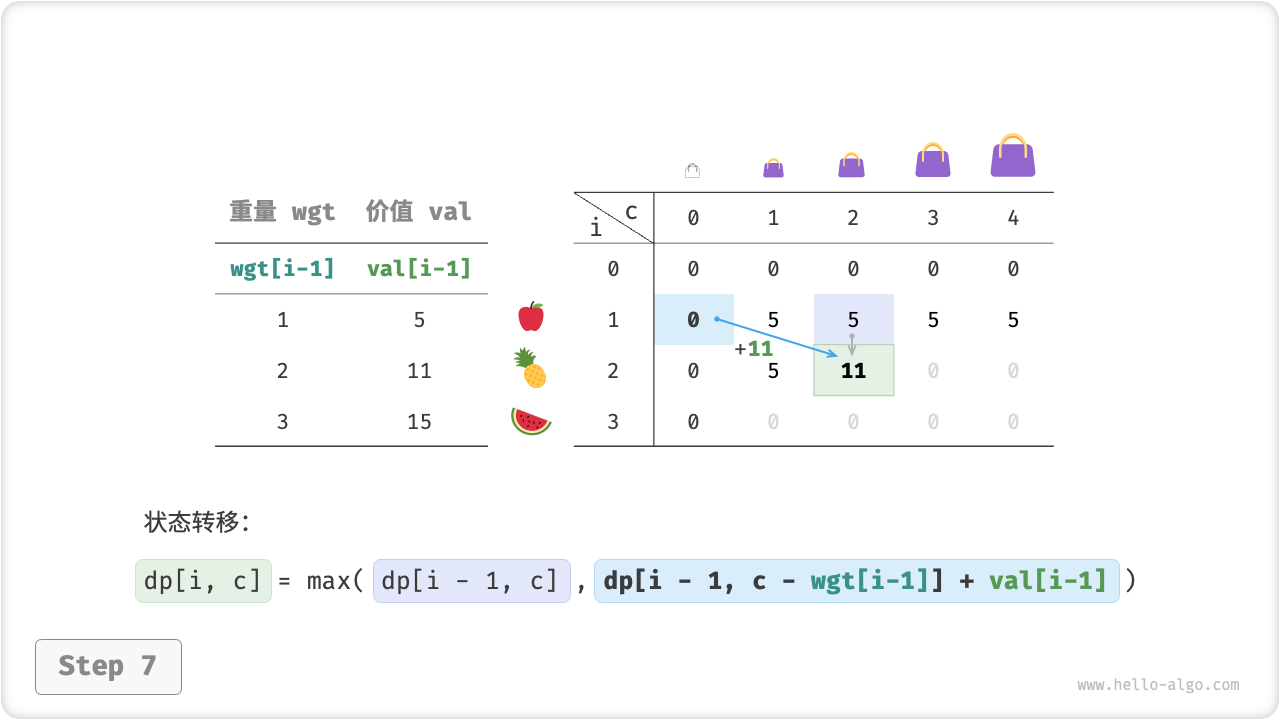 - 放入物品 \(i\) :背包容量减小 \(wgt[i-1]\) ,价值增加 \(val[i-1]\) ,状态变化为 \([i-1, c-wgt[i-1]]\) 。