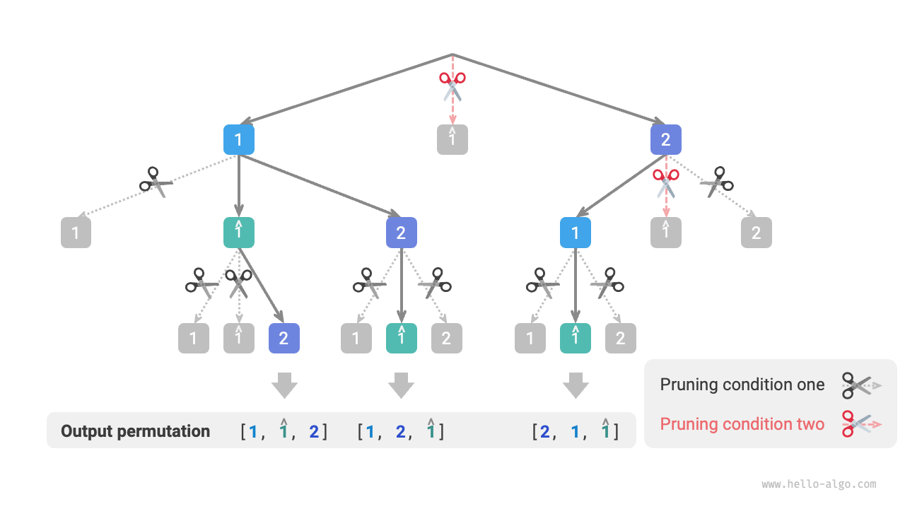 Figure 13-9 shows the scope of the two pruning conditions. Note, each node in the tree represents a choice, and the nodes from the root to the leaf form a permutation.