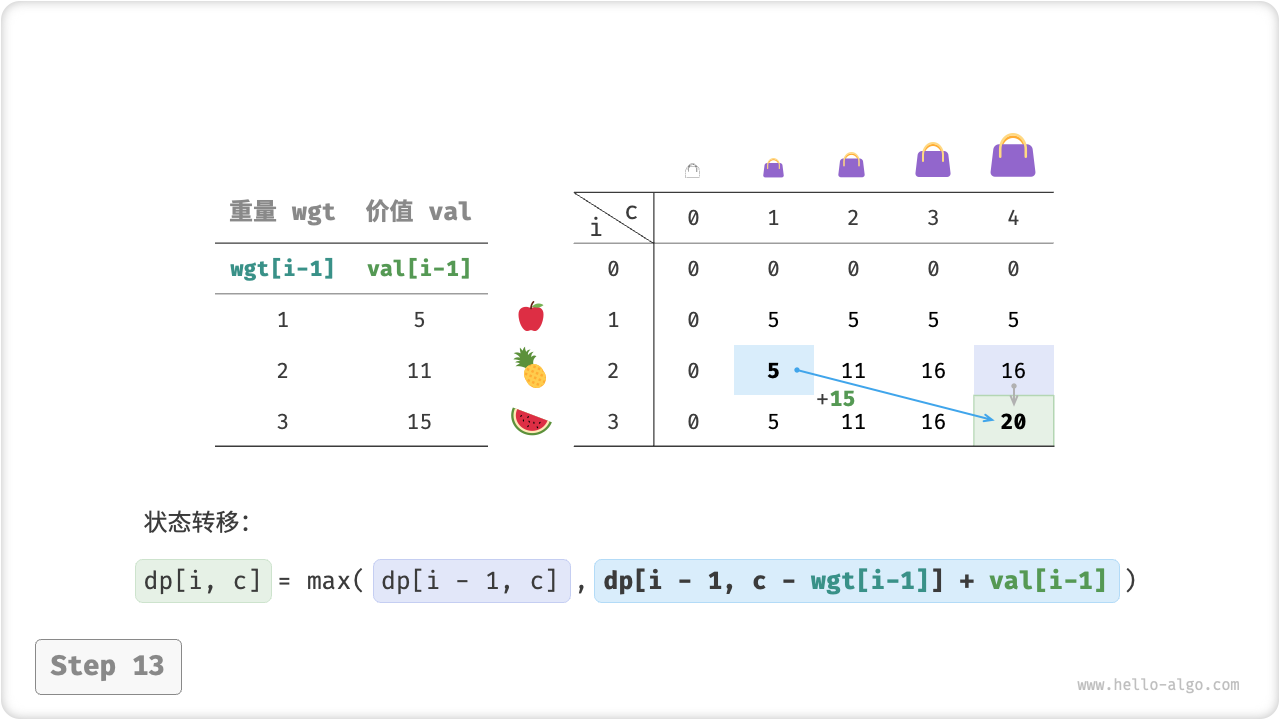 上述分析向我们揭示了本题的最优子结构:最大价值 \(dp[i, c]\) 等于不放入物品 \(i\) 和放入物品 \(i\) 两种方案中的价值更大的那一个。由此可推出状态转移方程: