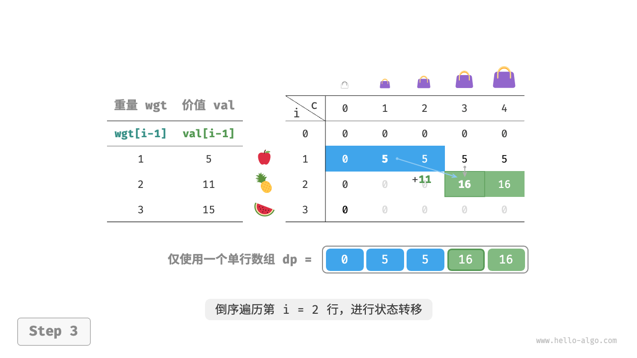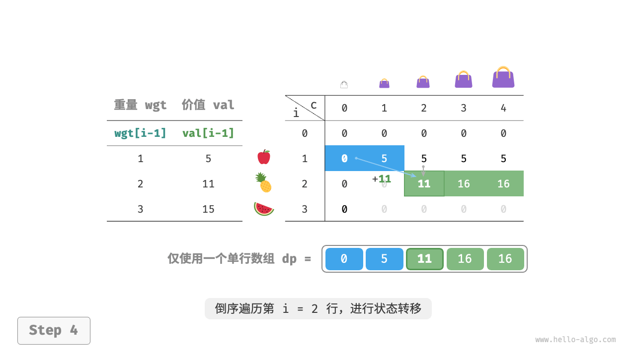 图 14-21 展示了在单个数组下从第 \(i = 1\) 行转换至第 \(i = 2\) 行的过程。请思考正序遍历和倒序遍历的区别。