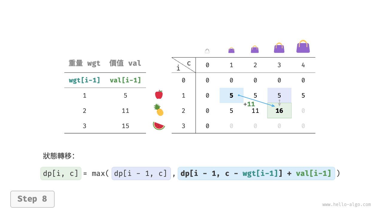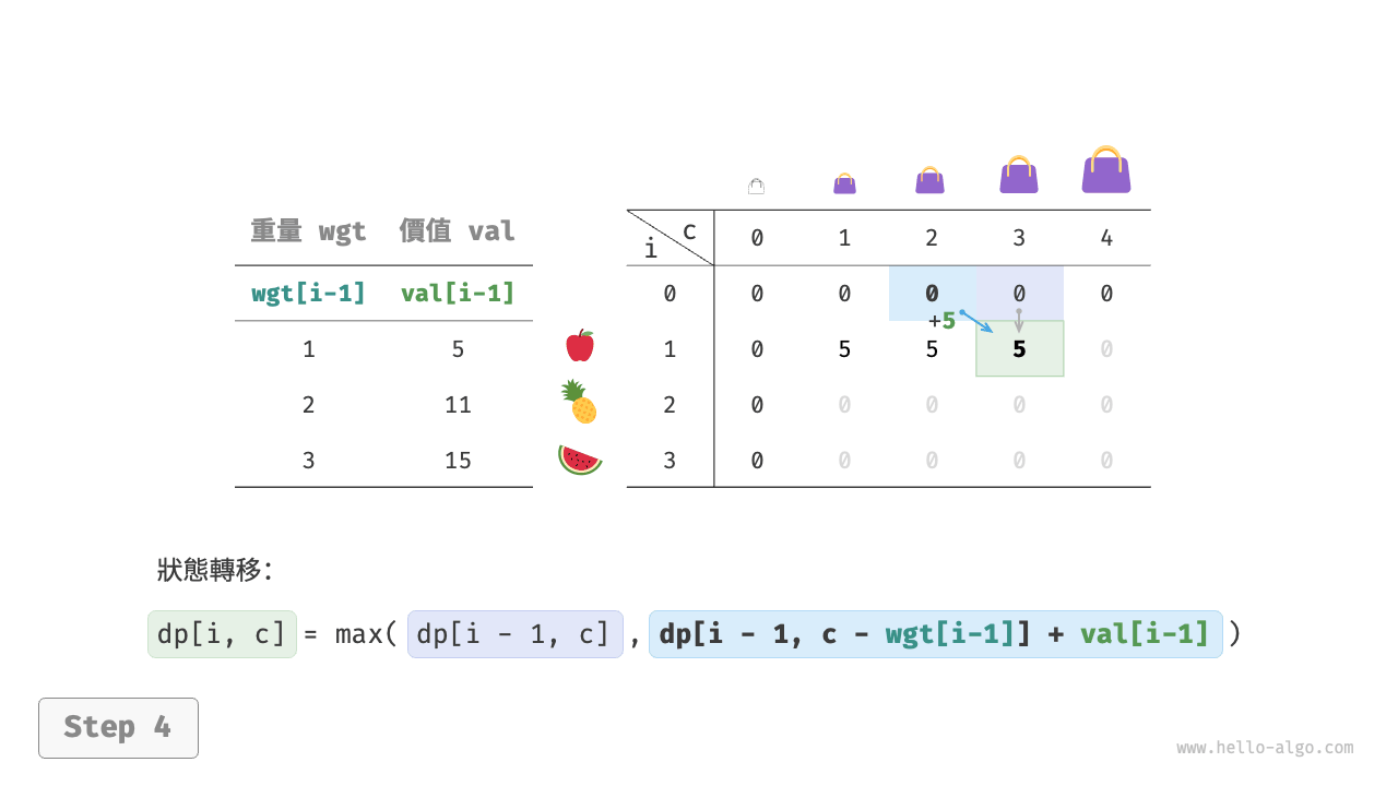 狀態 \([i, c]\) 對應的子問題為:前 \(i\) 個物品在剩餘容量為 \(c\) 的背包中的最大價值,記為 \(dp[i, c]\) 。
