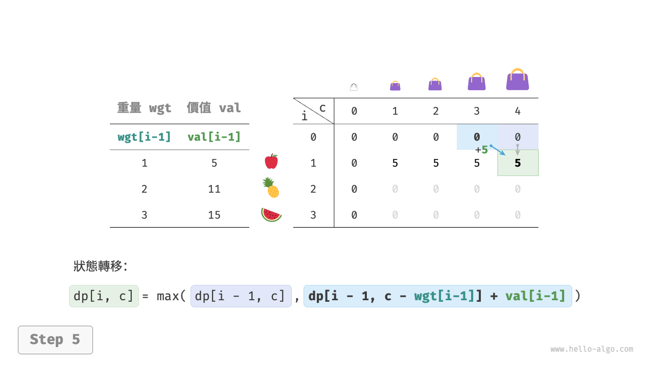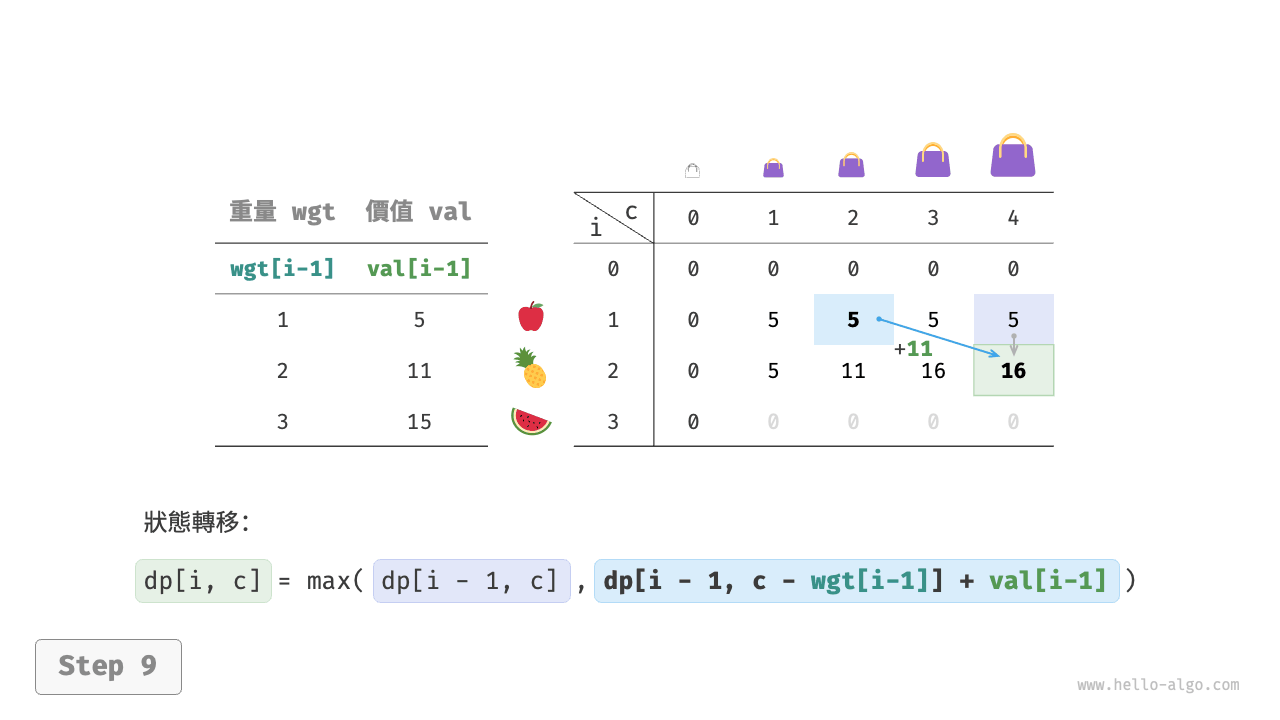 上述分析向我們揭示了本題的最優子結構:最大價值 \(dp[i, c]\) 等於不放入物品 \(i\) 和放入物品 \(i\) 兩種方案中價值更大的那一個。由此可推導出狀態轉移方程: