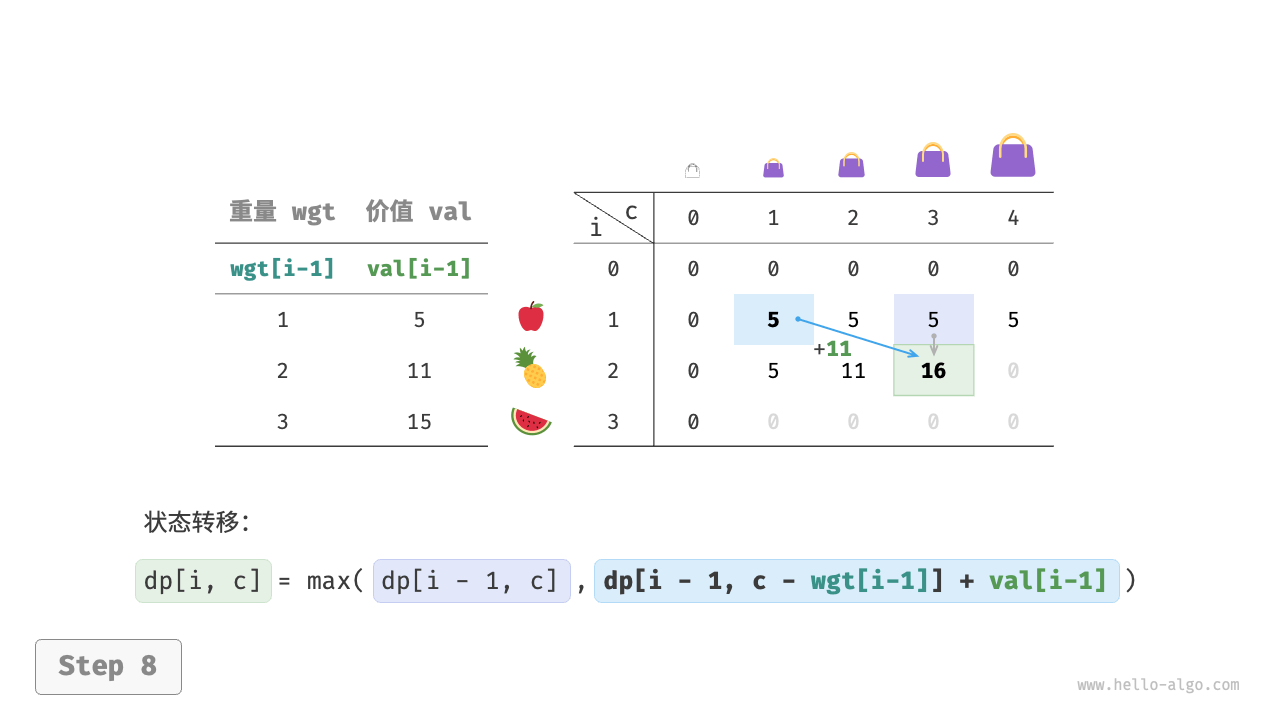 上述分析向我们揭示了本题的最优子结构:最大价值 \(dp[i, c]\) 等于不放入物品 \(i\) 和放入物品 \(i\) 两种方案中价值更大的那一个。由此可推导出状态转移方程: