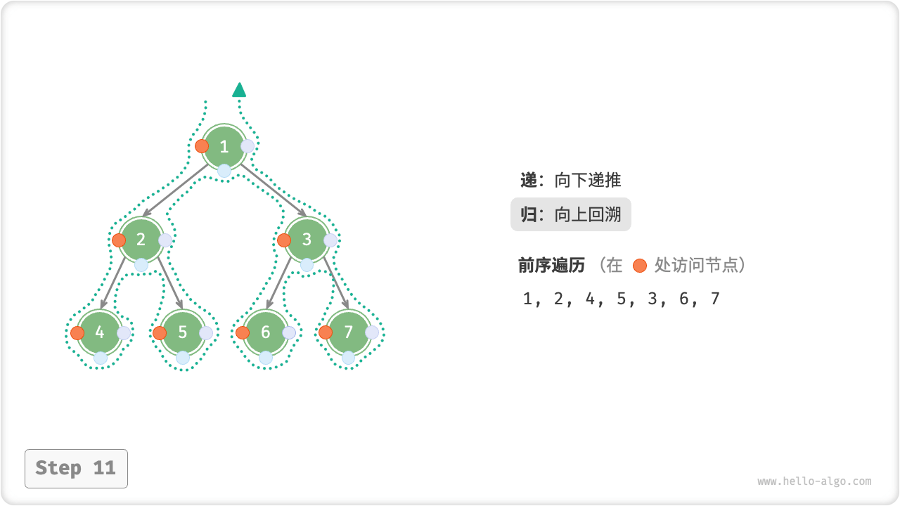 下图展示了前序遍历二叉树的递归过程,其可分为“递”和“归”两个逆向的部分。