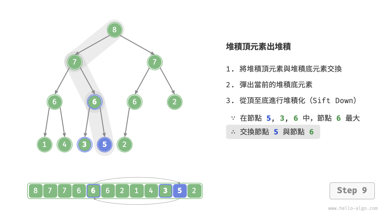 - 交換完成後,將堆積底從串列中刪除(注意,由於已經交換,因此實際上刪除的是原來的堆積頂元素)。
