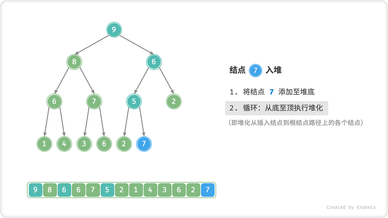 • 二叉树中的根结点对应「堆顶」,底层最靠右结点对应「堆底」。