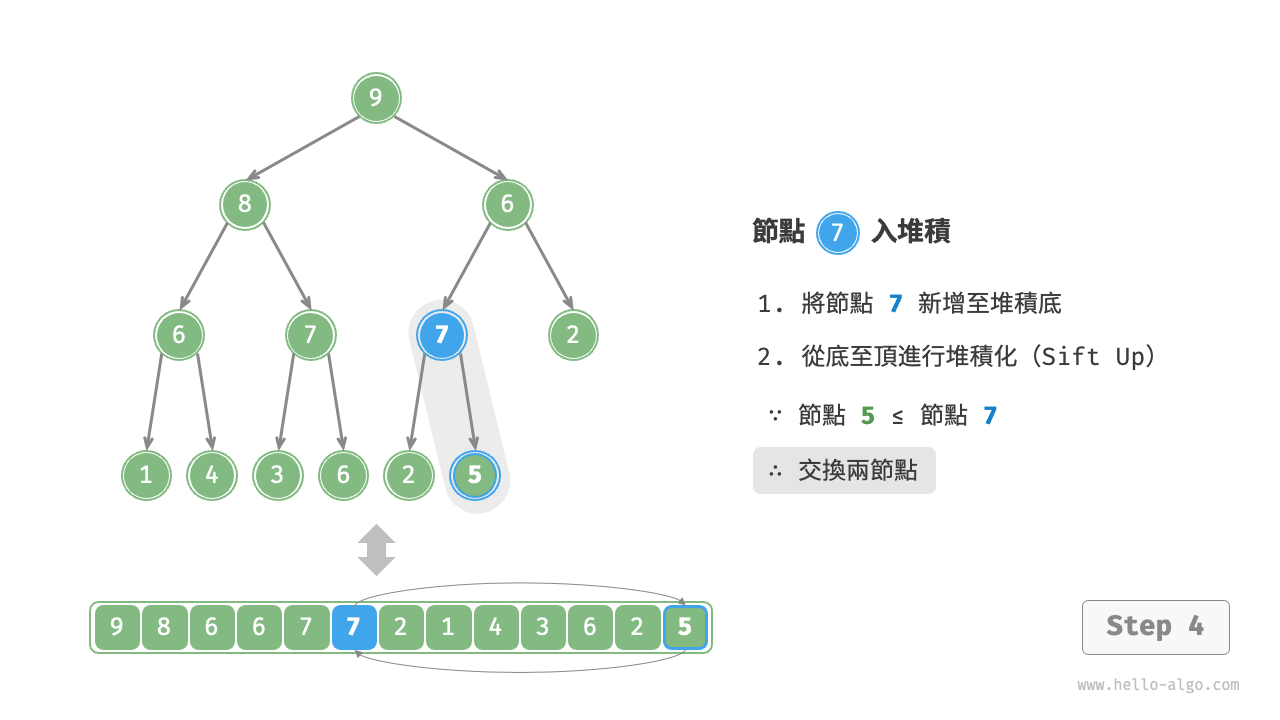 給定元素 val ,我們首先將其新增到堆積底。新增之後,由於 val 可能大於堆積中其他元素,堆積的成立條件可能已被破壞,因此需要修復從插入節點到根節點的路徑上的各個節點,這個操作被稱為堆積化(heapify)。