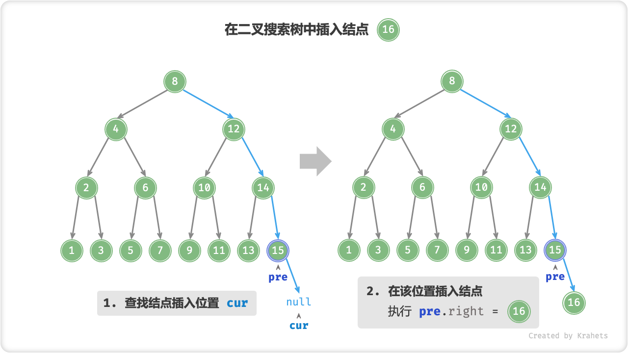 查找插入位置: 与查找操作类似,我们从根结点出发,根据当前节点值和