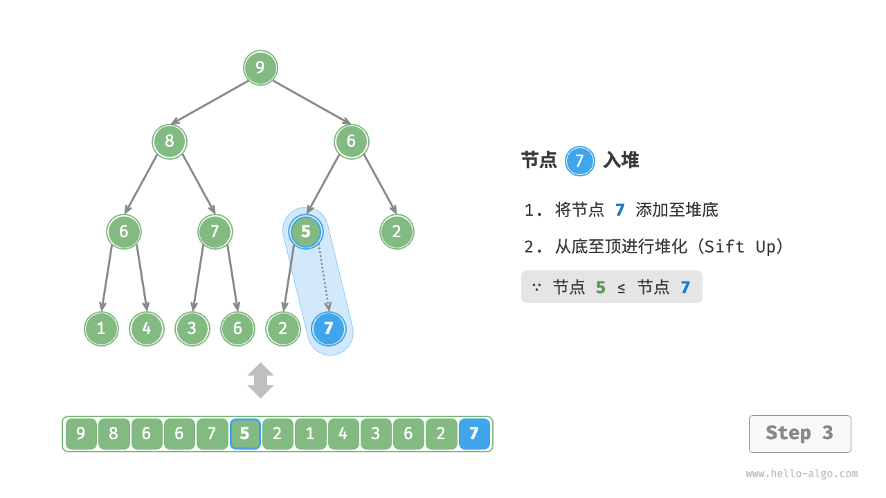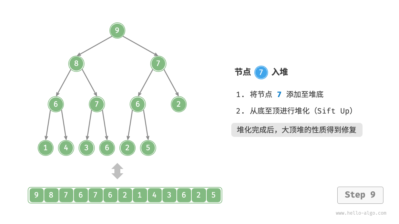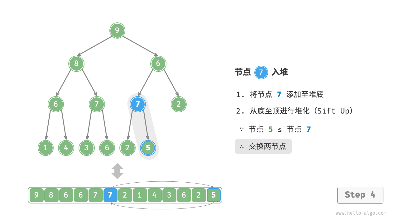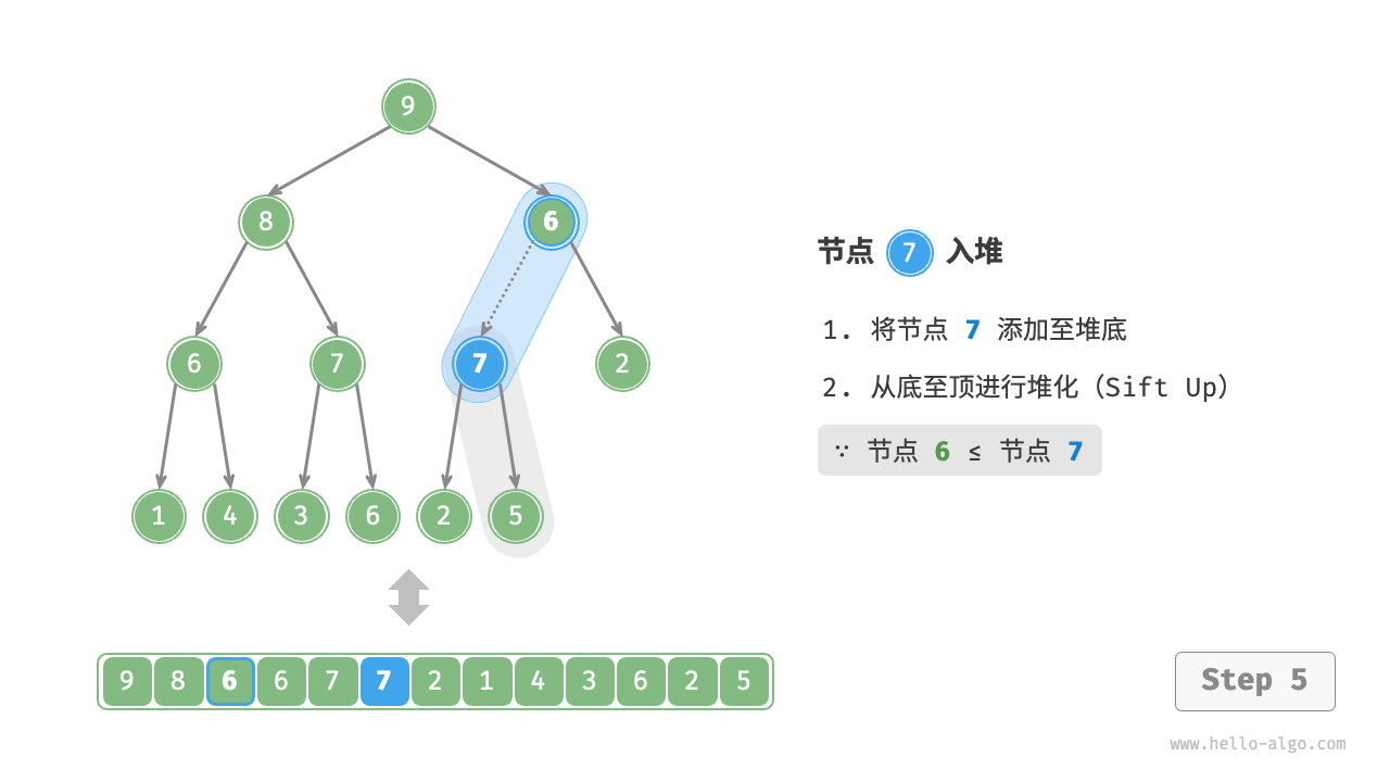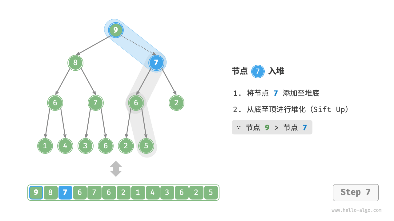 给定元素 val ,我们首先将其添加到堆底。添加之后,由于 val 可能大于堆中其他元素,堆的成立条件可能已被破坏,因此需要修复从插入节点到根节点的路径上的各个节点,这个操作被称为堆化(heapify)。