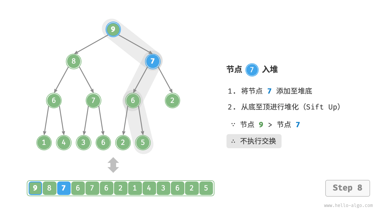 考虑从入堆节点开始,从底至顶执行堆化。如下图所示,我们比较插入节点与其父节点的值,如果插入节点更大,则将它们交换。然后继续执行此操作,从底至顶修复堆中的各个节点,直至越过根节点或遇到无须交换的节点时结束。